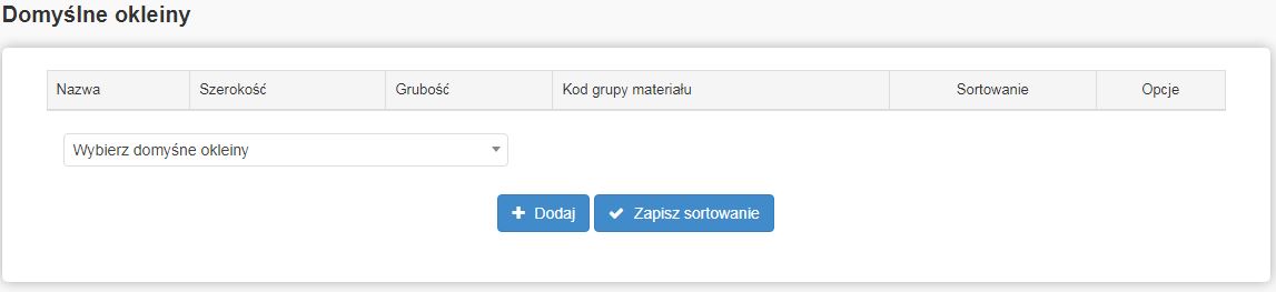 Pole to pozwala na przypisanie domyślnych oklein do blatów, tzn. takich, które będą się automatycznie dobierały użytkownikowi jako pierwsze podczas składania zamówienia. Przycisk „Dodaj” potwierdza przypisanie domyślnej okleiny.