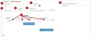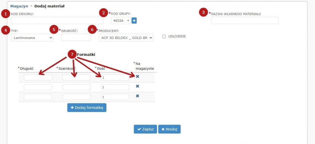 Znaczenie pól (1)-(7) opisano powyżej w sekcji „Dodaj materiał”.