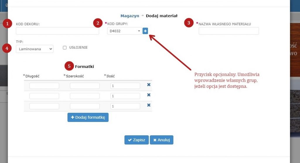 (4) Typ – lista wyboru, z której wybiera się typ dodawanego materiału np. Laminowana, MDF, Wiórowa.