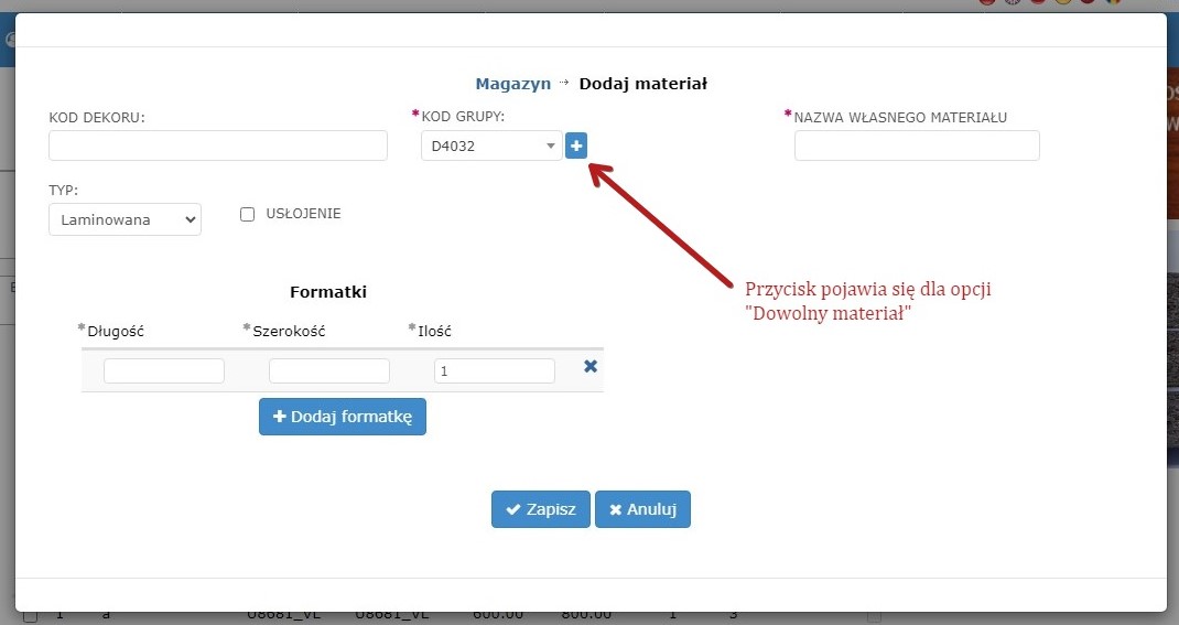 - Dowolny materiał – wprowadzony materiał może zostać przyporządkowany do zapisanej wcześniej przez hurtownię grupy (Kod grupy) lub klient może stworzyć własną grupę,