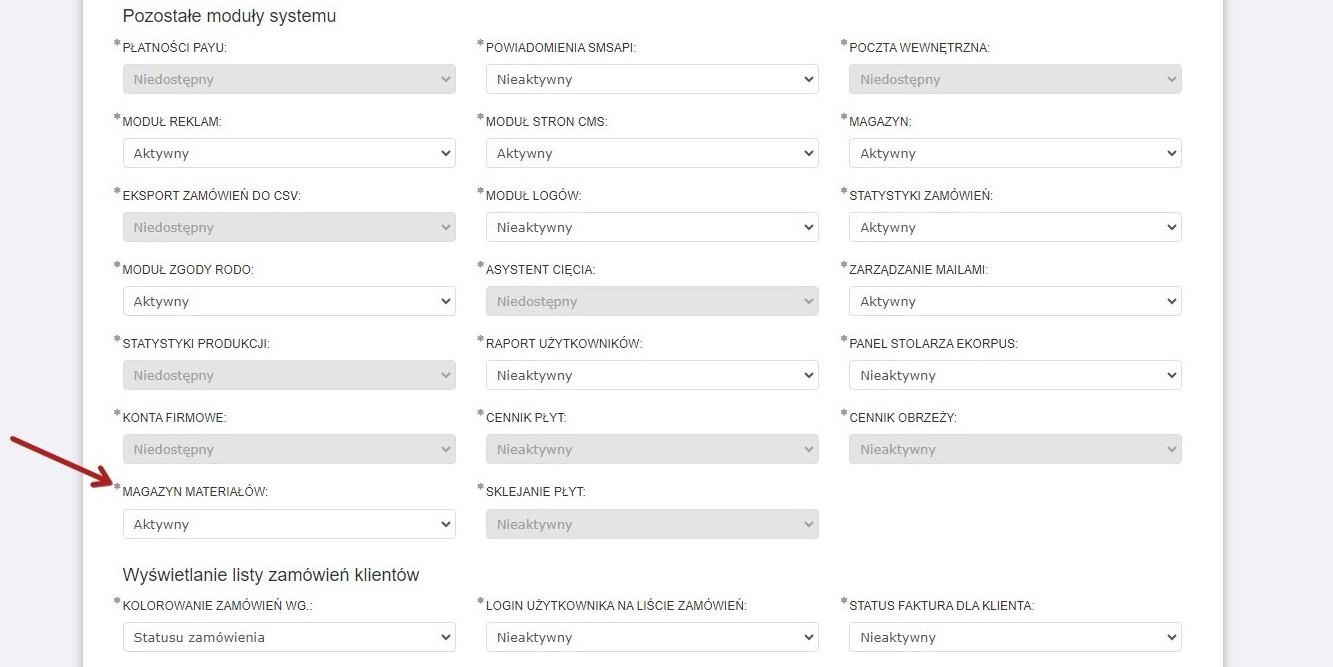 Admin -> Ustawienia modułów -> Magazyn materiałów