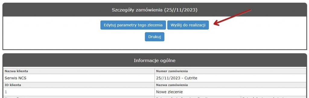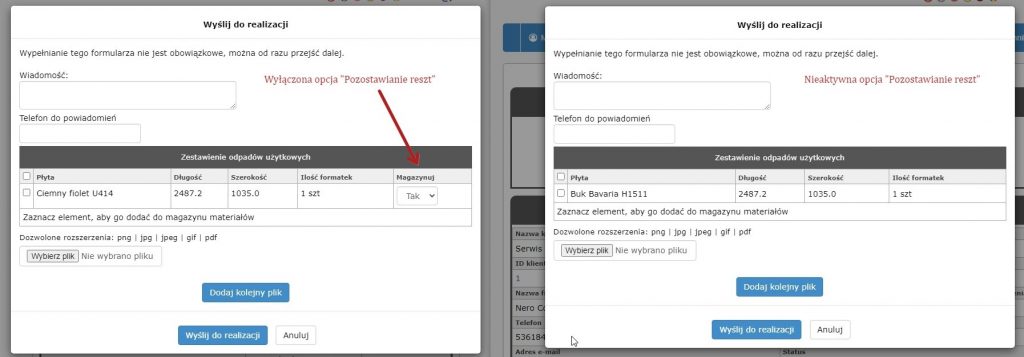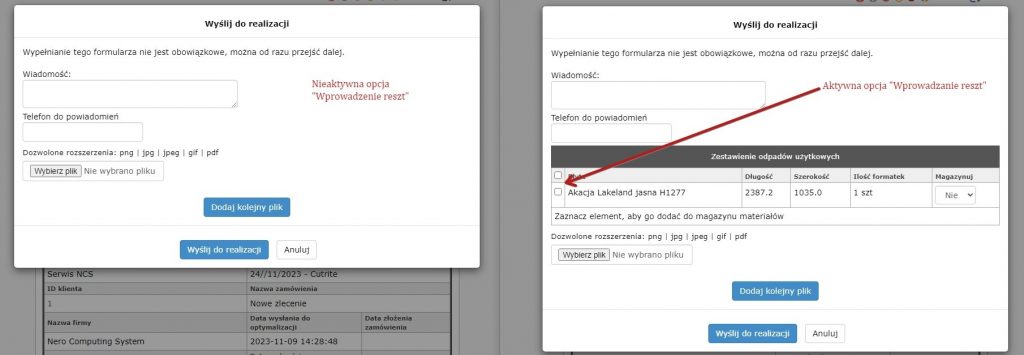 Po wykonaniu optymalizacji zamówienia istnieje możliwość zapisu odpadów użytkowych (reszt) do magazynu. W tym celu należy kliknąć przycisk „Wyślij do zamówienia” w Szczegółach zamówienia. Spowoduje to otwarcie okna „Wyślij do realizacji”.
