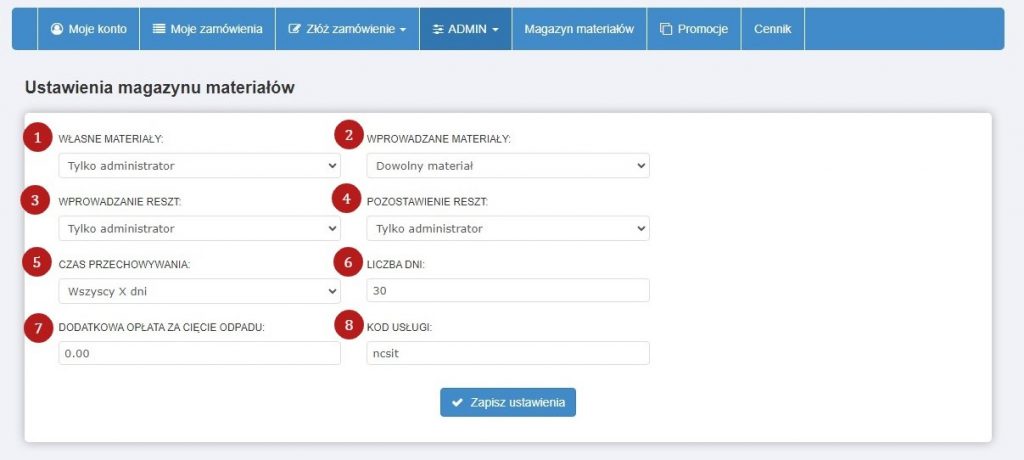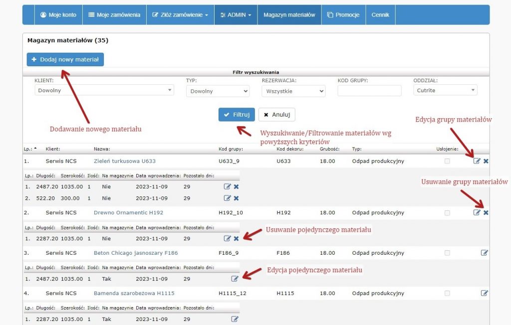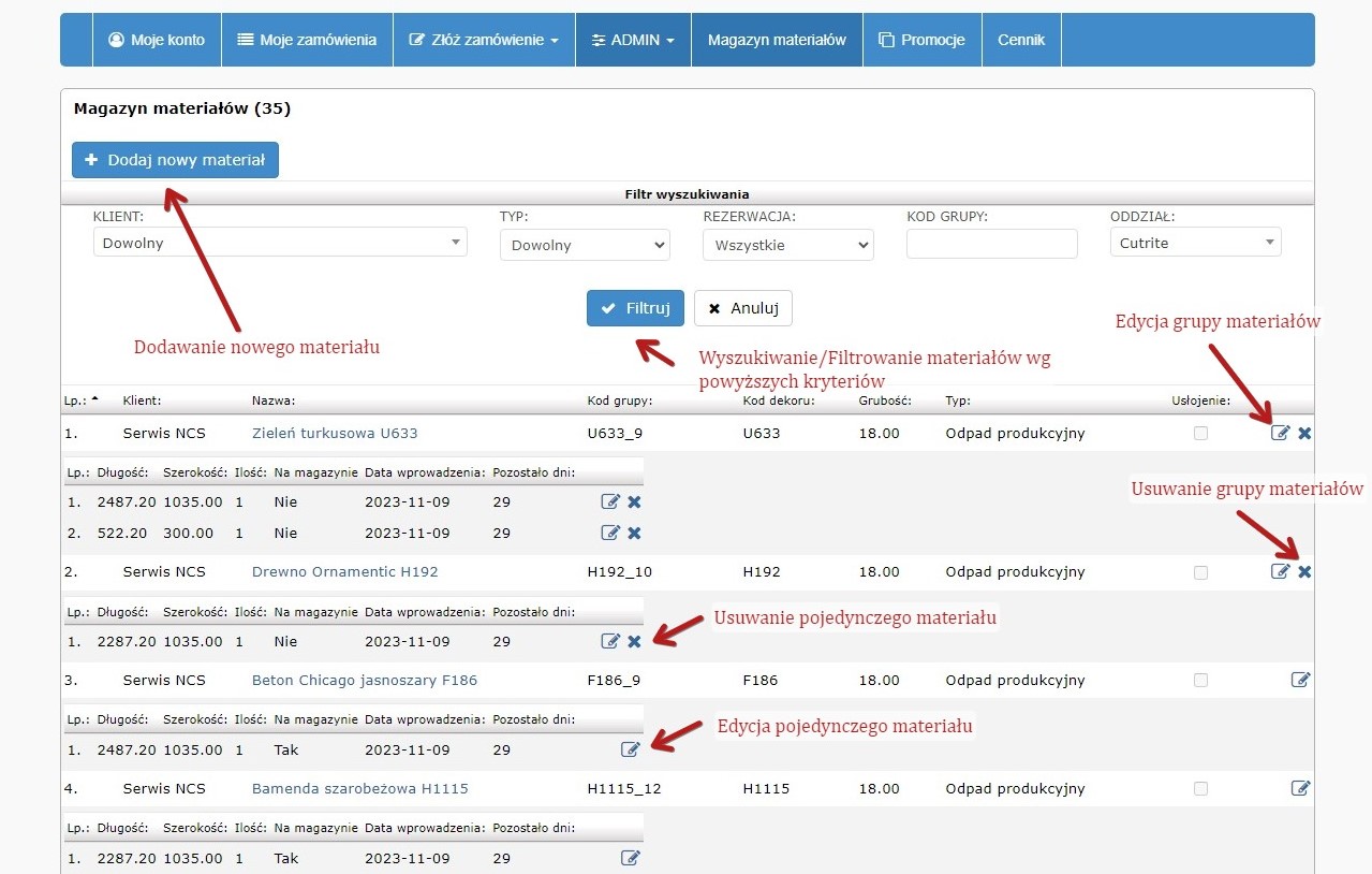 W zależności od uprawnień użytkownika dostępne są inne opcje. Klient może zarządzać wyłącznie własnymi materiałami, natomiast Administrator może zarządzać całą bazą.