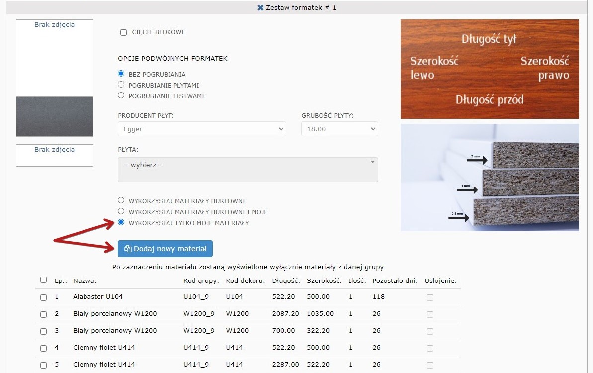 - Wykorzystaj tylko moje materiały – po wybraniu tej opcji system wyświetla listę wszystkich zapisanych materiałów klienta. Następnie klient zaznacza, które z nich mają wziąć udział w optymalizacji zamówienia. W przypadku tej opcji optymalizacja nie będzie brała pod uwagę płyt z hurtowni.