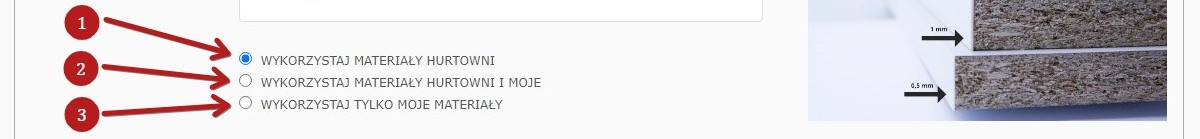 W celu wyboru materiału, z którego chcemy wykonać formatki dostępne mamy trzy opcje: