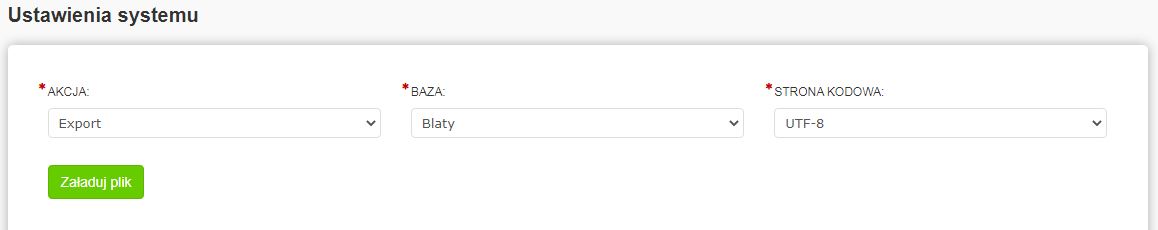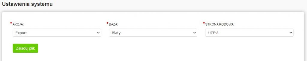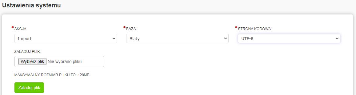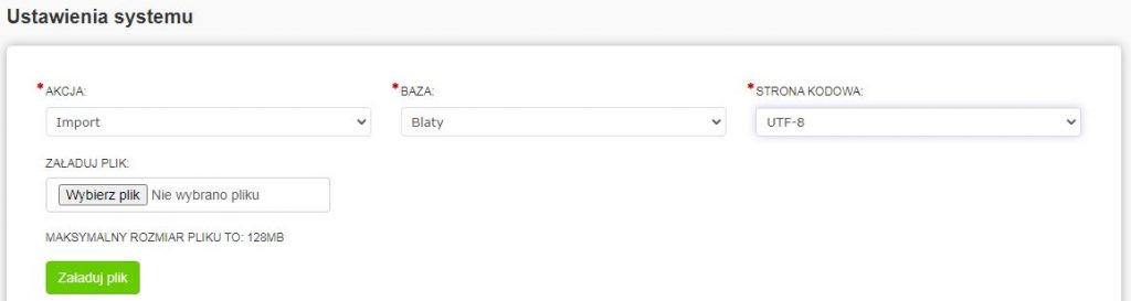 Następnie wybieramy akcję „Import”, typ bazy „Blaty” i klikamy przycisk „Wybierz plik” aby wskazać z aktualizowany plik na lokalnym dysku komputera. Następnie klikamy „Załaduj plik”.