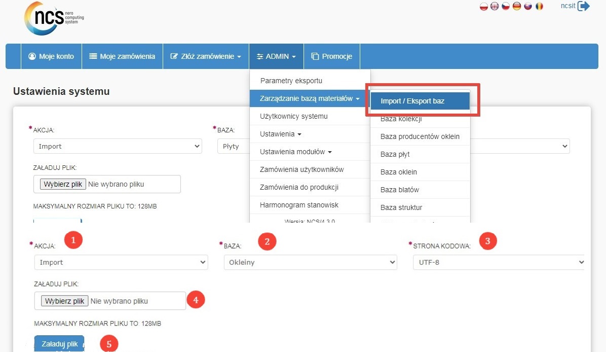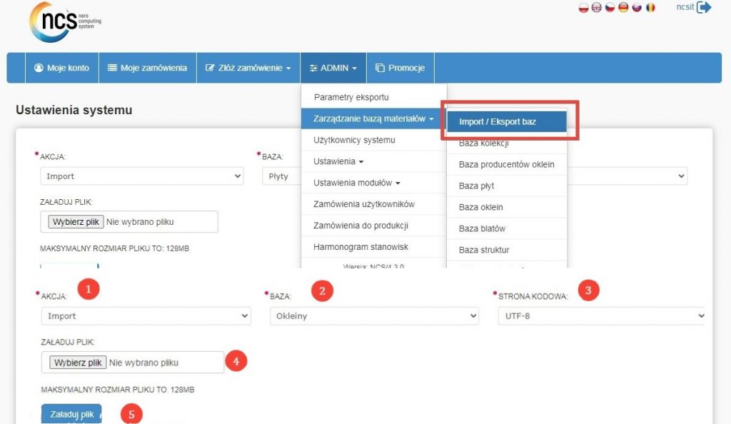 Przejść do ADMIN -> Zarządzanie bazą materiałów -> Import/Eksport baz.