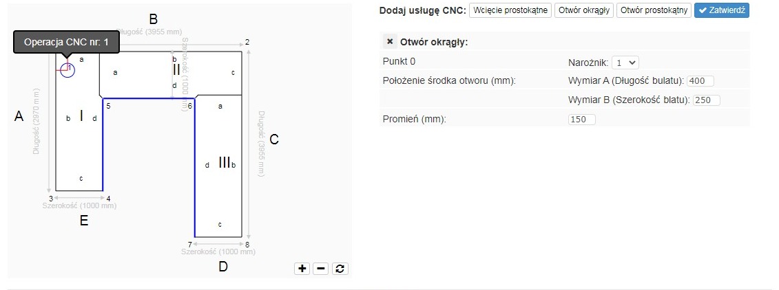 - Dodawanie operacji CNC tj: wcięcie, wycięcie otworu okrągłego czy prostokątnego