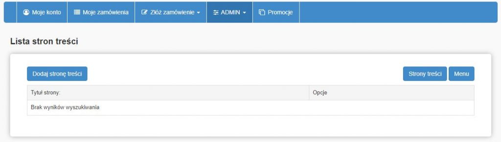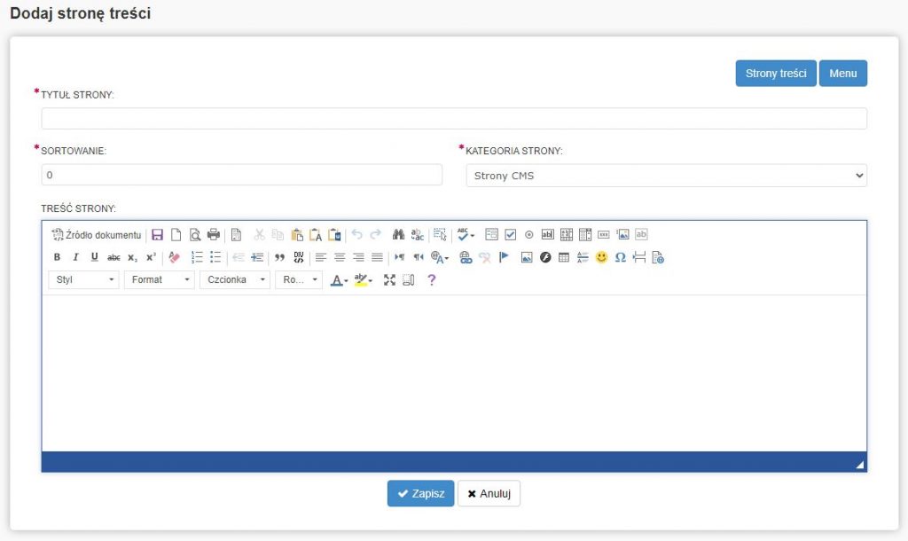 Aby dodać stronę treści należy nacisnąć „Dodaj stronę treści”, następnie system przekieruje nas do edytora widocznego poniżej.