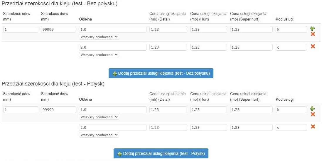 Po dodaniu kleju w Ustawieniach oddziału -> Oklejanie, pojawiają się ustawienia „Przedział szerokości dla kleju” z rozdzieleniem na: