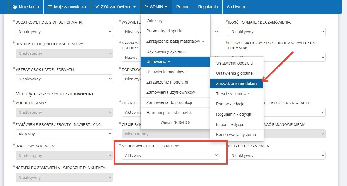 Moduł jest możliwy do aktywacji w panelu ADMIN -> Ustawienia -> Zarządzanie modułami -> Moduł wyboru kleju okleiny