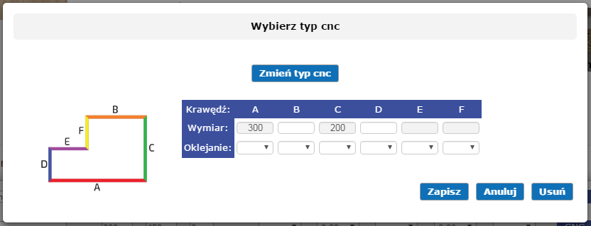Należy wprowadzić brakujące wymiary zgodnie z rysunkiem oraz oklejanie. Na koniec wcisnąć przycisk Zapisz.