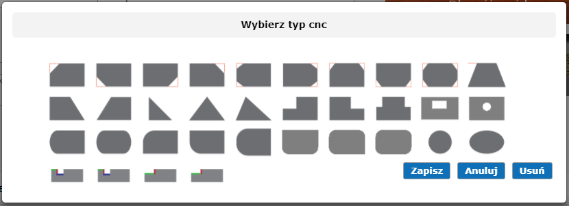 Po naciśnięciu przycisku CNC kształty wyświetli się lista oferowanych przez eRozrys kształtów.