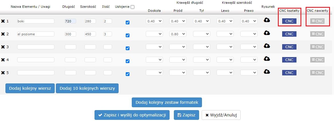 Niektóre wersje eRozrysu pozwalają dodatkowo na zamówienie formatek z wykonanymi na nich dodatkowymi cięciami, frezami lub nawiertami. Jeżeli dany eRozrys posiada tę funkcję, można ja uruchomić używając przycisku CNC kształty lub CNC nawierty w formularzu wprowadzania formatek. Przed użyciem przycisku należy wprowadzić długość i szerokość formatki.