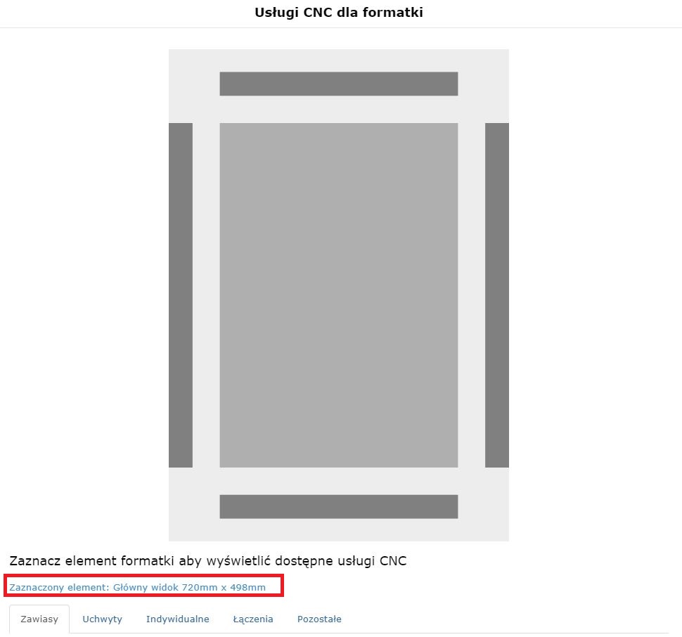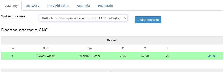Poniżej znajduje się lista dostępnych usług CNC dla danej formatki. Pierwszą zakładką są zawiasy