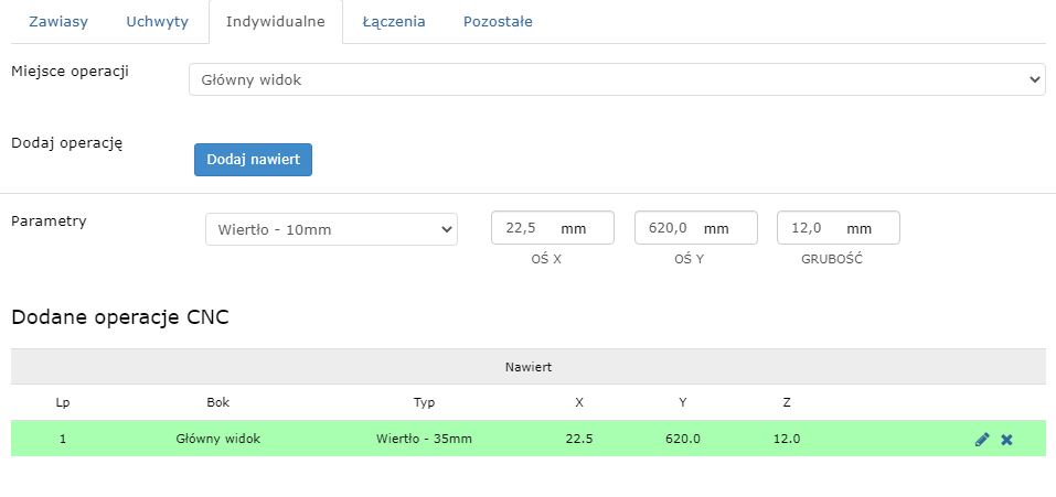 Do wyboru z rozwijanej listy mamy nawierty różnego rodzaju, po naciśnięciu przycisku „Dodaj operacje” jest ono dodawane do listy nawiertów. Edycja danego nawiertu przenosi nas do zakładki „Indywidualne” gdzie możemy indywidualnie dostosować dany nawiert do własnych potrzeb lub też dodać nowy.