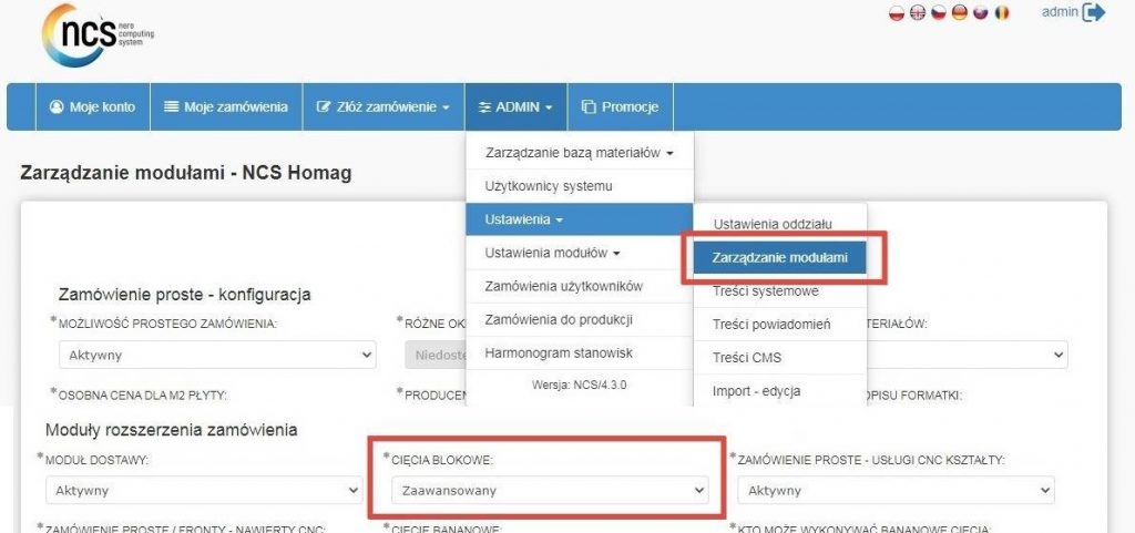 Moduł Cięcia Blokowego można włączyć za pomocą ADMIN -> Ustawienia -> Zarządzanie modułami.