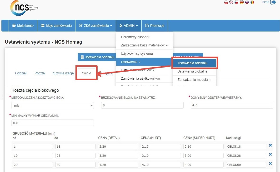 Należy wybrać opcję Zaawansowany przejść na dół strony i zapisać zmiany klikając na przycisk „Zapisz ustawienia modułów” następnie przejść do ustawień działów ADMIN -> Ustawienia -> Ustawienia oddziału -> Zakładka Cięcie -> Sekcja „Koszta cięcia blokowego”