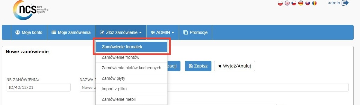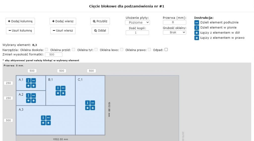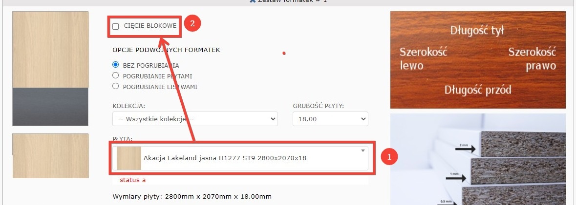 Po wprowadzeniu wszystkich ustawień będzie możliwe oznaczenie opcji „Cięcie blokowe” przy składaniu nowego zamówienia. Złóż zamówienie -> Zamówienie formatek.
