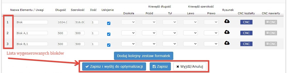 Po zapisaniu na dole w zamówieniu pojawi się lista elementów które zostały wygenerowane. W przypadku gdy chcemy utworzyć kolejny blok lub dodać dodatkowe formatki do optymalizacji potrzebne jest dodanie kolejnego pod-zamówienia klikając w przycisk „Dodaj kolejny zestaw formatek„.