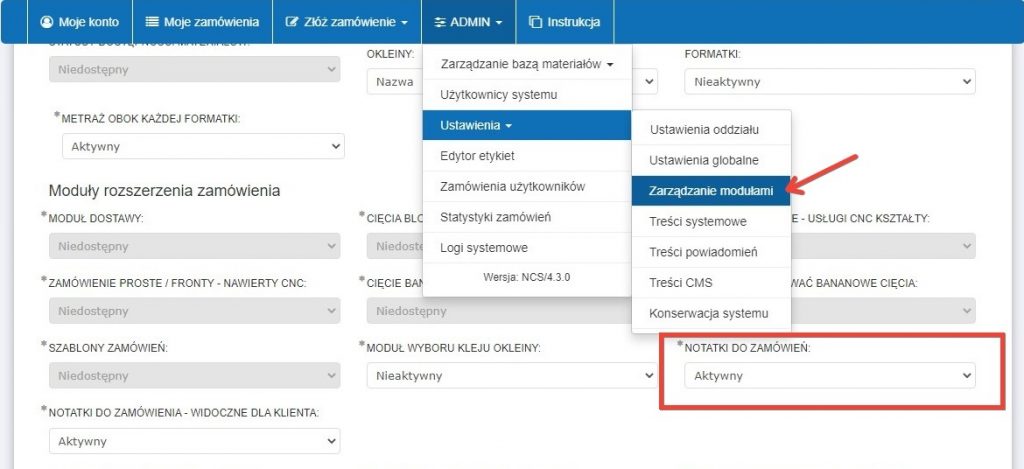 Aby aktywować moduł należy udać się do panelu ADMIN -> ustawienia -> zarządzanie modułami -> notatki do zamówień