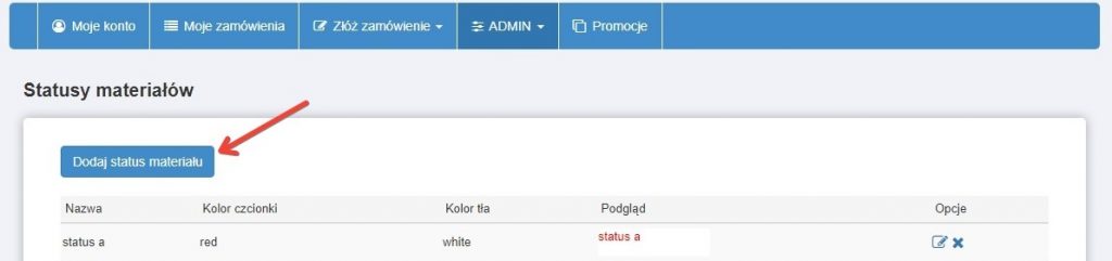Dodawanie statusów do bazy odbywa się w panelu ADMIN -> zarządzanie bazą materiałów -> statusy materiałów.