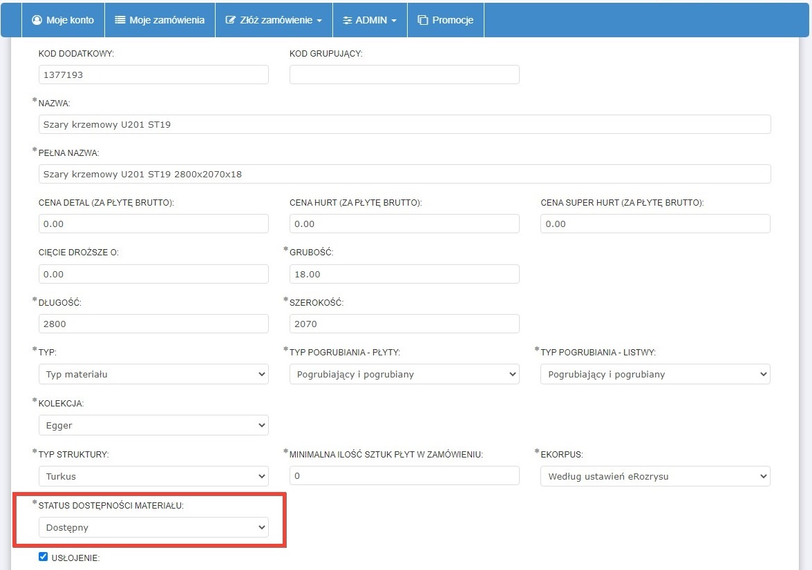 Aby dodać status do materiału należy edytować daną płytę / okleinę w erozrysie i w polu „Status dostępności materiału” ustawić wybrany status.