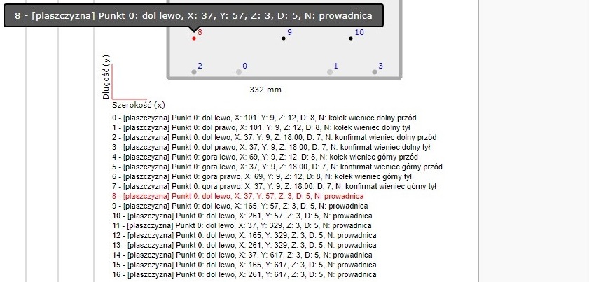 Pod każdą formatką znajduje się lista operacji CNC dla danej formatki, najeżdżając myszką na dany nawiert także wyświetla się informacja na jego temat.