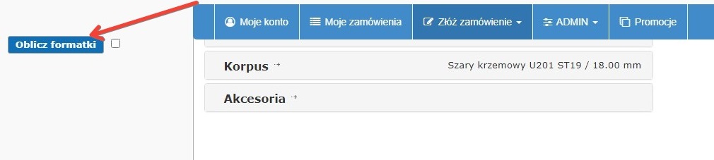 Aby wyświetlić formatki należy skorzystać z przycisku „Oblicz formatki”