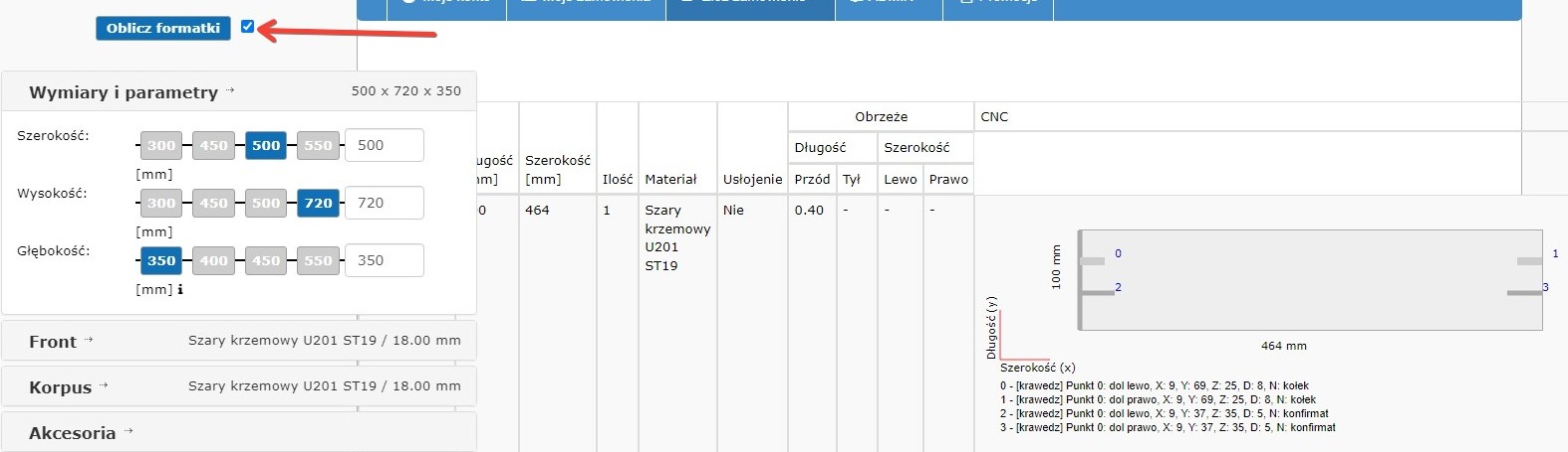Przydatną funkcją jest także okno wymiary i parametry w formie „dymku”, które pozwala na bieżąco edytować wymiary formatek. Aby je aktywować należy zaznaczyć check-box obok przycisku „Oblicz formatki”.