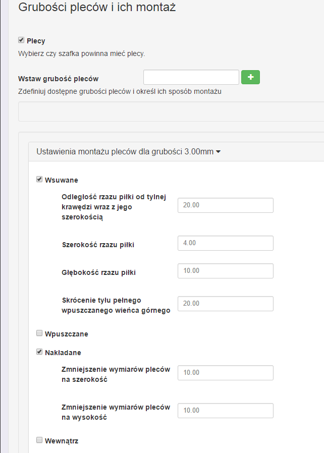 Domyślne ustawienia obróbki pleców – w tym miejscu wpisujemy domyślne wartości, które będą się wyświetlały podczas dodania danej grubości płyty pleców podczas tworzenia szafki (widoczne na poniższym zrzucie ekranu). Parametry obróbki pleców zostały szczegółowo opisane na stronie dotyczącej ustawień ogólnych szafki.