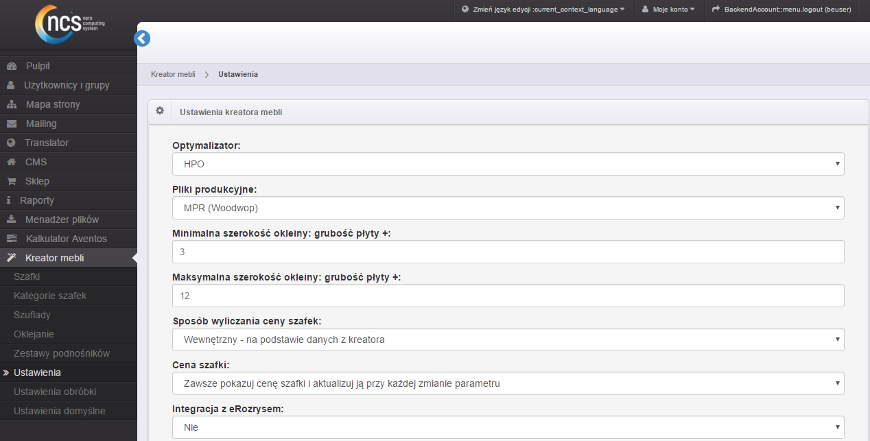 Pliki produkcyjne – wybór typu pliku pod maszynę CNC, jaki ma być generowany przez Kreator Mebli. Pliki są możliwe do pobrania w konkretnym zamówieniu w zakładce Sklep -> Zamówienia -> Opcje -> Pobierz pliki produkcyjne. Po zmianie wartości tej opcji (np. z MPR na FMC), przy ponownym pobieraniu pliki wygenerują się na nową maszynę.