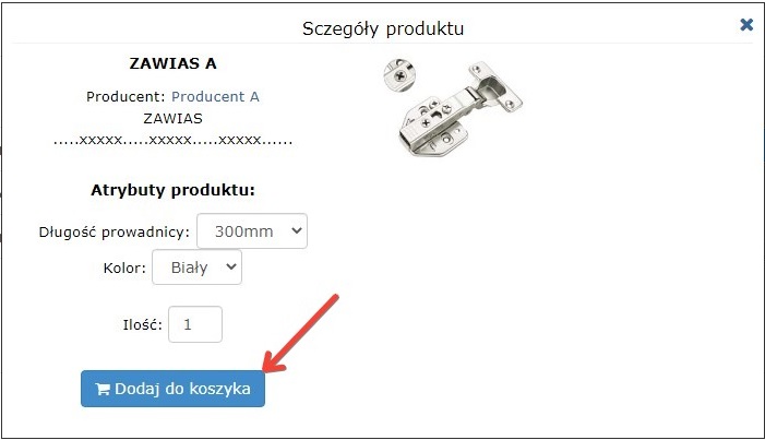 Po wyborze produktu użytkownik ma możliwość wyboru oferowanych atrybutów oraz ilości. Po skonfigurowaniu produktu dodanie do koszyka odbywa się poprzez przycisk „Dodaj do koszyka”