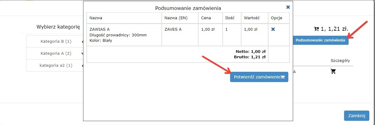 Po dodaniu wszystkich wybranych produktów do koszyka, można wyświetlić jego zawartość poprzez przycisk „Podsumowanie zamówienia”, gdzie także możemy je zatwierdzić za pomocną przycisku „Potwierdź zamówienie”.