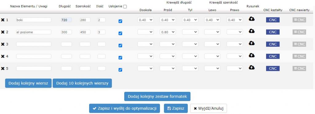 Formularz pozwala na wprowadzenie nieograniczonej ilości formatek. W każdym wierszu należy wprowadzić wymiar formatki, jej oklejanie oraz ilość. Nazwa elementu nie jest konieczna. Oklejanie dla formatek jest przedstawione na grafice powyżej: za krawędź przednią uważa się dłuższą krawędź będącą bliżej operatora CNC. Krawędzie lewe i prawe sa odpowiednio po lewej i prawej stronie. Ostatnią krawędź uważa się za krawędź tylną.