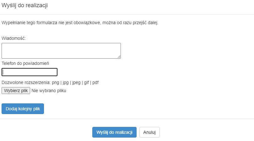 - Po powrocie zamówienia z optymalizacji wyślij zamówienie do realizacji. W tym kroku zostanie wyświetlony formularz z wiadomością oraz numerem tel. do powiadomień (formularz można pominąć)