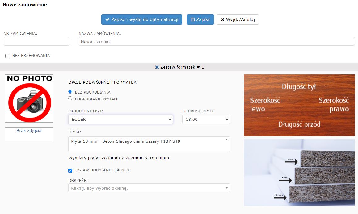 - Nazwa zamówienia – nazwa całego zamówienia składającego się z dowolnej ilości zestawów formatek.