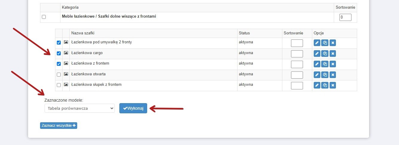 W celu jednoczesnego usunięcia kilku szafek zaznacz je, a następnie rozwiń listę „Zaznaczone modele”, wybierz pozycję „Usuń” i kliknij przycisk „Wykonaj”.