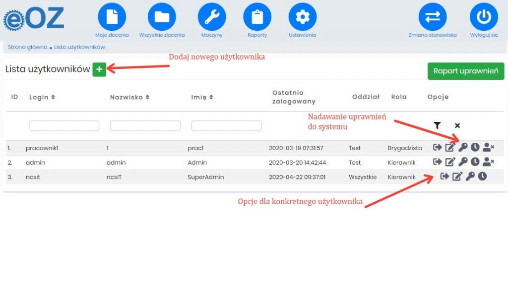 Dodatkowo w zależności od posiadanych uprawnień dostępne są opcje: