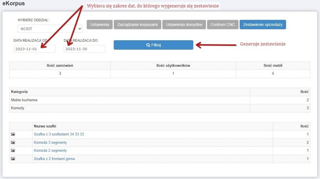 Umożliwia wygenerowanie zestawienia sprzedaży zwierającego uporządkowane informacje o ilości, typie, rodzaju, czy kategorii sprzedanych szafek.